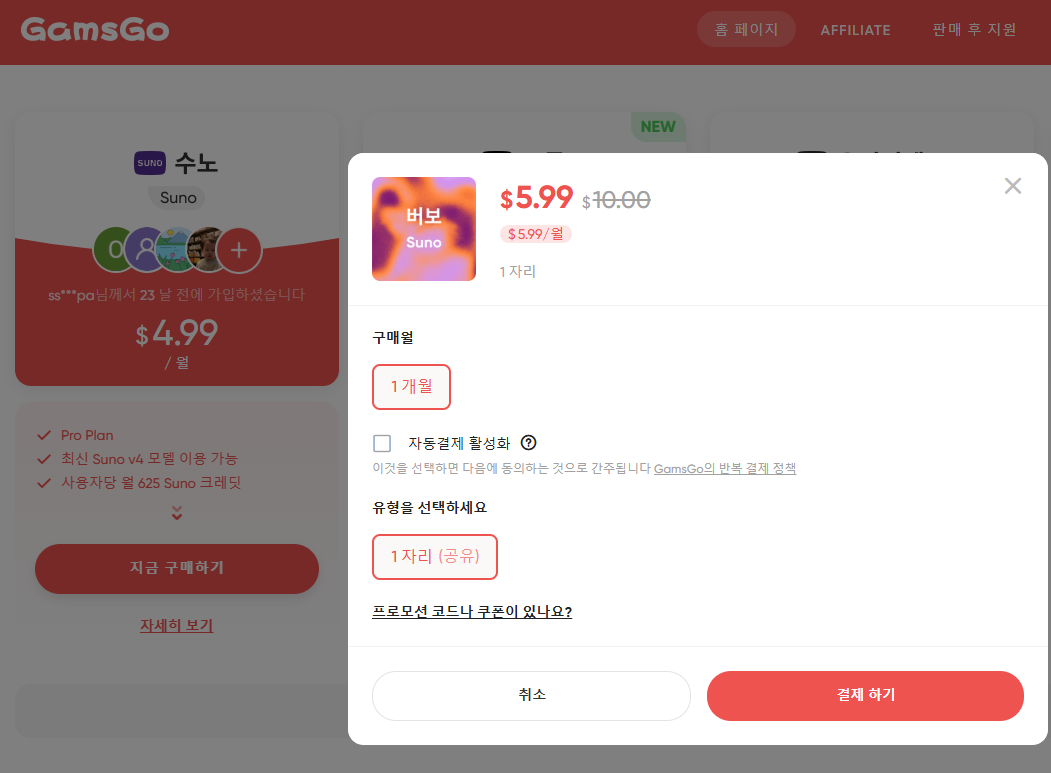 2. 그 후 원하는 서비스(예: suno.com(음악만드는 ai))를 고르고, 파티(공유 그룹)에 가입 신청을 합니다.
